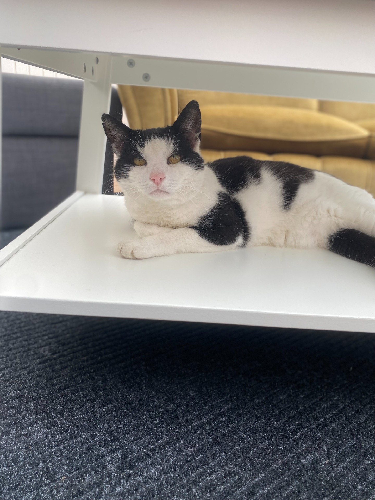 Skabbe är en före detta dagiskatt som under större delen sitt liv har bott på dagis och kjelat med barn. Han älskar att bli klappad och ompysslad av alla.